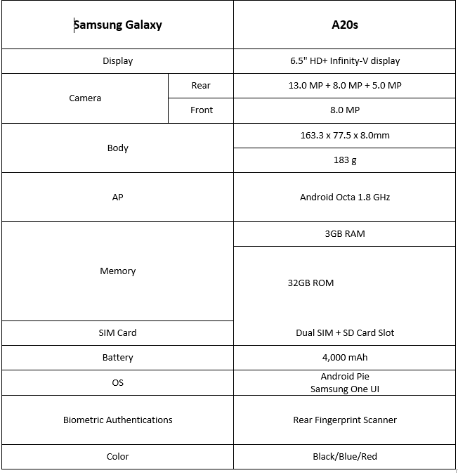 Samsung Electronics unveiled the new Galaxy A20s introducing a new contemporary look with improved innovations. Made for those who want to capture and share their experiences instantaneously, the Galaxy A20s delivers the performance you need for the Era of Live. With a versatile triple camera, an uninterrupted large infinity display and long-lasting battery life, this new smartphone includes upgraded features that matter the most.