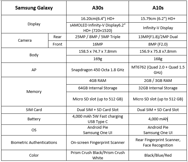 Samsung Electronics unveiled the new Galaxy A30s and A10s, introducing a new contemporary look with improved innovations. Made for those who want to capture and share their experiences instantaneously, the Galaxy A30s and Galaxy A10s deliver the performance you need for the Era of Live. With a versatile camera, an uninterrupted infinity display and long-lasting battery life, these new smartphones include upgraded features that matter to these users the most.
