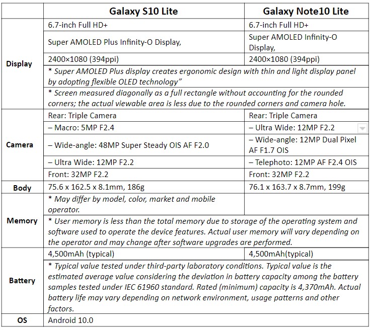 Galaxy Lite series offers a suite of camera features and capabilities, building on Samsung’s industry-leading camera technologies and bring them to more widely accessible devices. Galaxy S10 Lite and Galaxy Note10 Lite offer edge-to-edge Infinity-O displays. With a 6.7-inch screen size, the display provides an expansive and immersive experience. The Galaxy S10 Lite and Galaxy Note10 Lite are packed with a large 4,500mAh battery and super-fast charging capabilities, allow to stay connected longer and spend more time doing the things which people love. The Galaxy S10 Lite and Galaxy Note10 Lite come with Samsung’s ecosystem of apps and services, including Bixby, Samsung Pay, and Samsung Health. As you would expect, these Galaxy Lite devices are also protected with defense-grade security platform Samsung Knox.