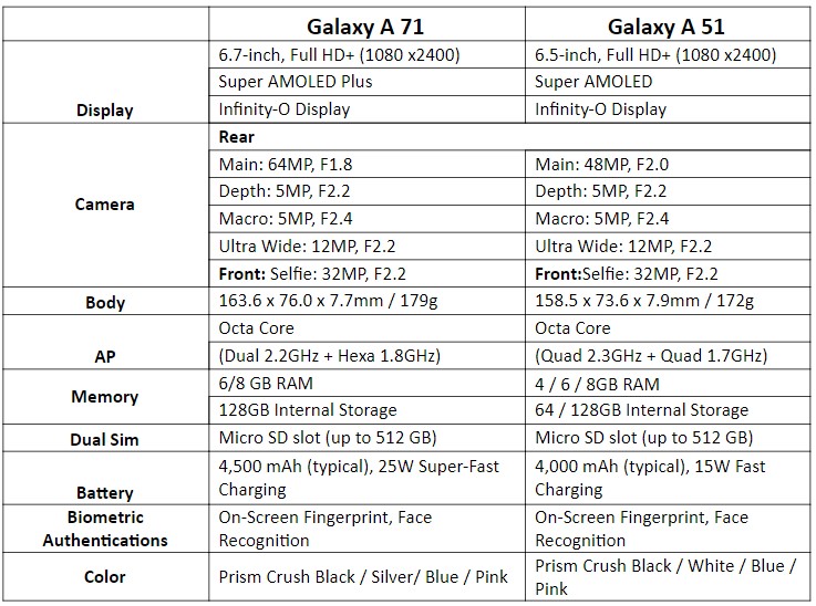 Galaxy A71 offers Super AMOLED Plus and Galaxy A51 offers Super AMOLED edge-to-edge Infinity-O displays. With a screen size of 6.7-inch or 6.5-inch, the display provides an expansive and immersive experience – forget the world around you and watch your favorite show or game on one of Samsung’s largest screens yet.