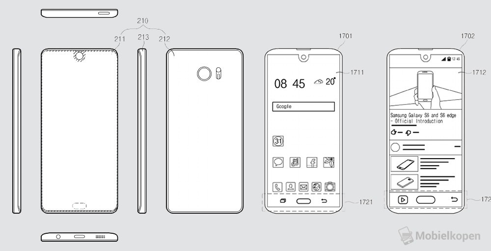 No, at least not for this time, we will not relate this patent with Galaxy S9, as the device is set to launch next month at MWC, but this upcoming smartphone (possibly Note 9) will be unveiled somewhere near November or earlier next year. According to the new patent, first reported by MobielKopin, Samsung is working on several smartphone designs with bezel-less screens, front-facing cameras, and sensors, all hidden by a quite similar yet different notch to iPhone X.