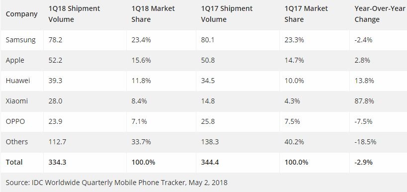 Samsung keeps sitting at the top with 78.2 million units shipped, which gives it a market share of 23.4%, though that is a decline of 2.4% compared with the same quarter of 2017. Apple is in second place, with 52.2 million units shipped and a market share of 15.6%, which is an increase of 2.8% compared with Q1 2017.