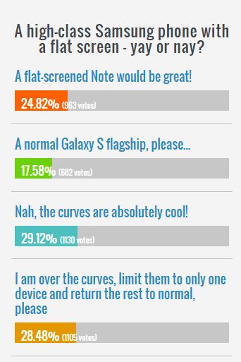 The poll conducted by the site asked questions like “A high-class Samsung phone with a flat-screen – yay or nay?” with options given for users to vote such as; “A normal Galaxy S flagship, please…” and “Nah, the curves are absolutely cool!”. However, the majority of the voters liked the option that Samsung had been practicing previously limiting the curves “to only one device and return the rest to normal, please”.