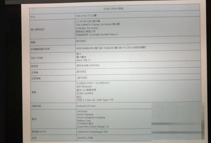 An image supposedly showing the specs sheet of the unannounced Sony smartphone with model number H8541 has just surfaced from China. Sony H8541 seems to be the company’s first 2018 flagship which will accompany a 5.7-inch display with 4K resolution and Corning Gorilla Glass 5 covering.