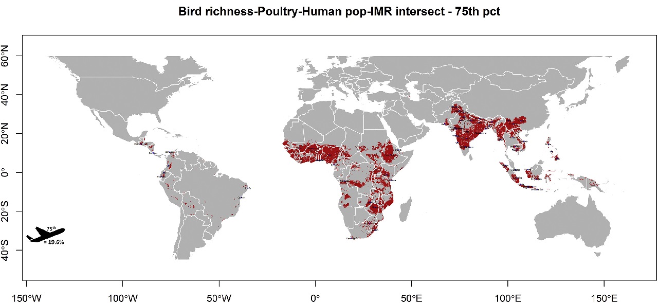The authors say, “We identify areas where the sharing of space between wildlife and humans is high, health system performance is low, and critical interfaces are located adjacent to cities with high global connectivity.”