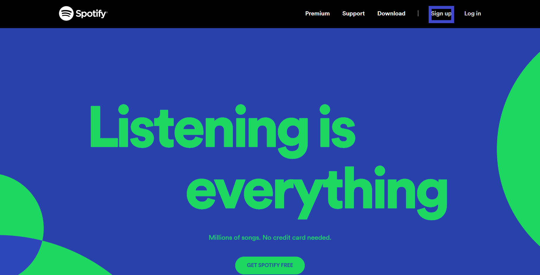 Assuming you are new to Spotify, you can sign up for a Spotify account by heading into spotify.com and click on sign up as highlighted below: