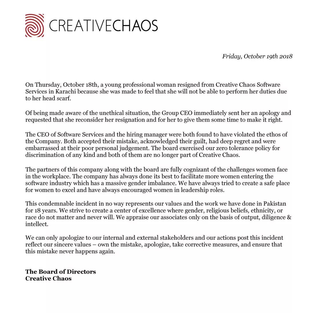 While various movements and programs in Pakistan are encouraging young women to enter the technology industry, discriminatory behavior as such brings the efforts to ground zero. There are examples from the Girls Can Code series where religious attire did not hold back female professionals to pursue leadership roles in technology companies. While these examples encouraged a lot of female professionals to kickstart their careers, the discriminatory behavior exhibited by Creative Chaos will be discouraging for many young female professionals.
