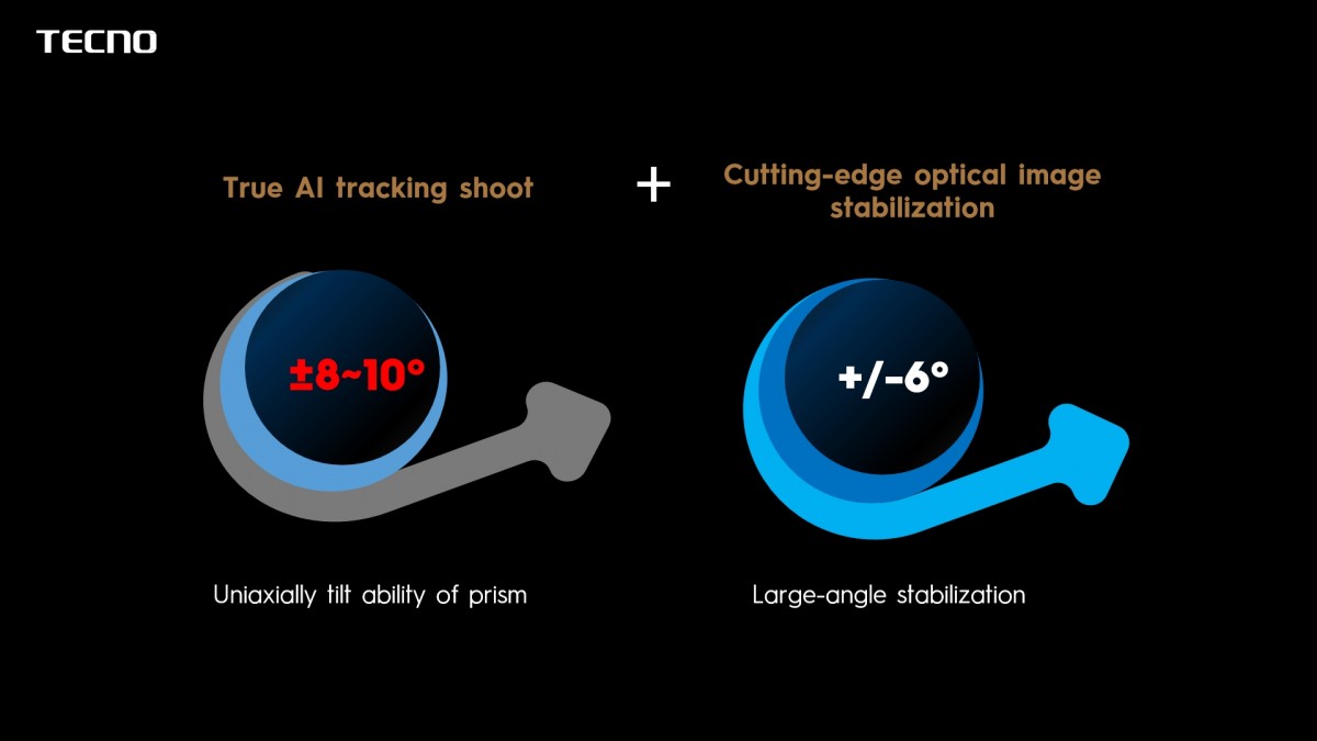 A system of two prisms instead of one (it’s the first of its kind). Each prism can rotate along one axis – one can do +/-8°, the other +/-10°. With the two prisms combined the camera is able to automatically track an object – by as much as +/-16° on one axis and +/-20° on the other, according to Tecno.