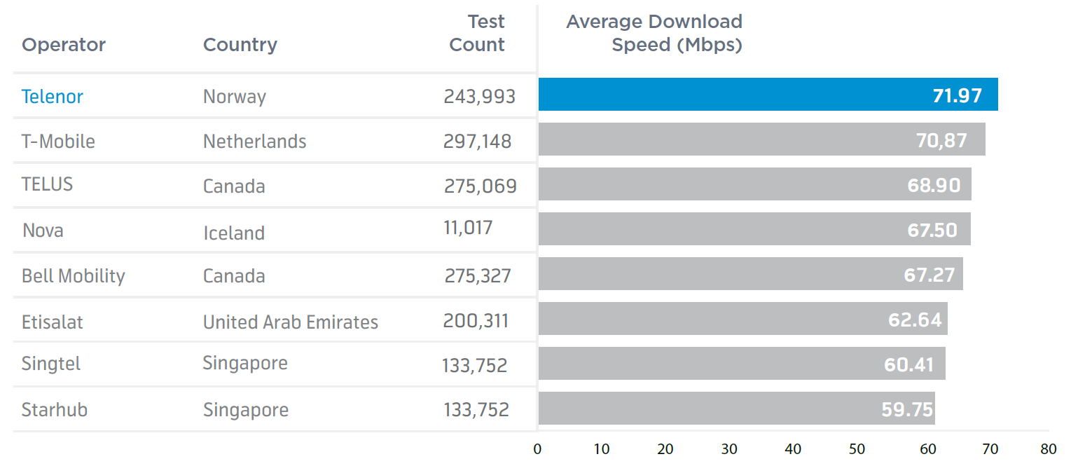 By the end of last year, approximately 120,000 speed tests conducted by Ookla revealed that Norwegian carrier Telenor was the world’s fastest mobile network operator for the second-quarter of 2018. However, the Speedtest data (by Ookla) recently ranked Telenor as the world’s fastest carrier for the whole of 2018; with the highest average download speed of 71.97 Mbps on modern (LTE-capable) devices.