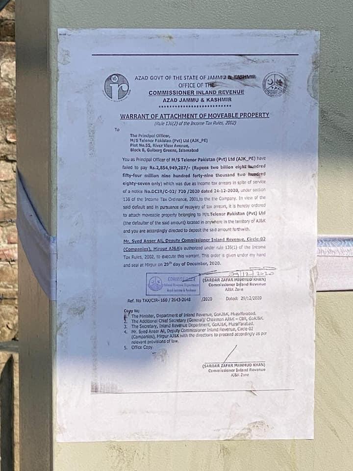 Telenor tower controllers across Azad Jammu and Kashmir have been sealed by the Commissioner Inland Revenue for payment of Rs. 2,854,949, 287 in income tax arrears. According to the Commissioner office, a notice was served to the company prior to the sealing of the towers.