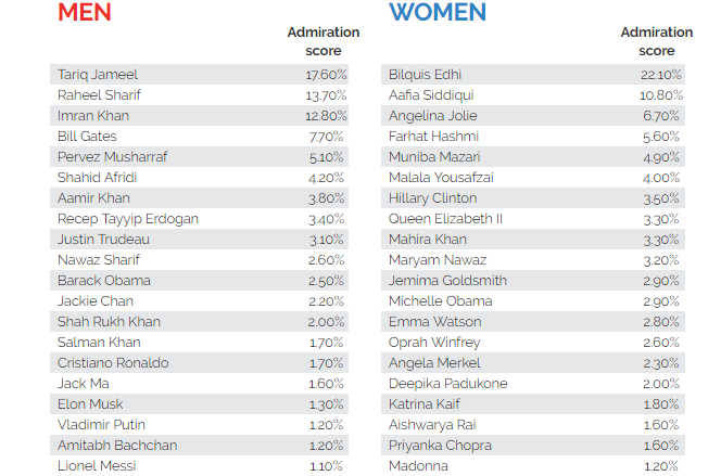 In Pakistan’s case, Maulana Tariq Jameel has topped the men’s list while Bilquis Edhi, the wife of late philanthropist, Abdul Satar Edhi has topped the women’s list. Surprisingly Imran Khan came third and Malala Yousafzai came at the 6th number in the local ranking as you can see in the image below.