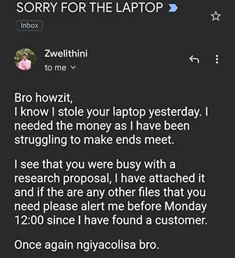 Zweli_Thixo, a Twitter user, revealed an email that he had received from a thief who had stolen the laptop containing his research proposals. In an email, the thief apologized for his act and stated that “they have been struggling to make ends meet.” However, the thief also asked the man to send back all his important files if the laptop owner needed them.
