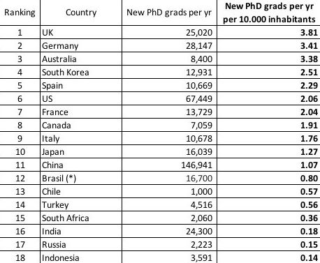 However, it should be noted here that if the population of the above countries is taken into account to plot the number of doctoral graduates against the per head population then the above ranking appears to be very different.