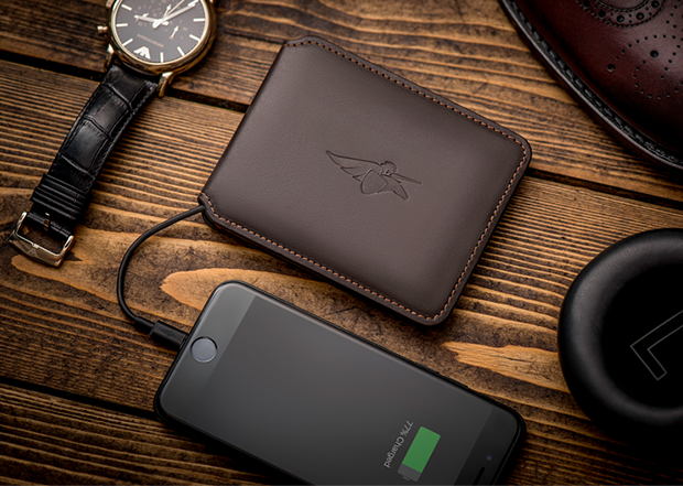 The smart wallet can be used to contain money and identification cards. The smart wallet also guarantees protection for the RFID protection against stray interference from the circuit of the wallet. For charging the power bank that comes with the wallet, an optional leather pad is available that provides wireless charging capabilities.