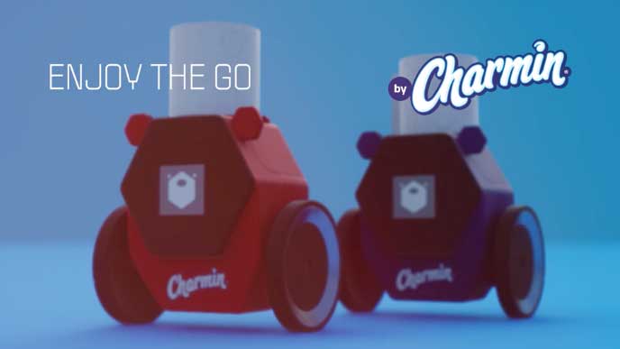 It looks like a cartoon bear on wheels. That navigate towards human beings in need of a Toilet Paper