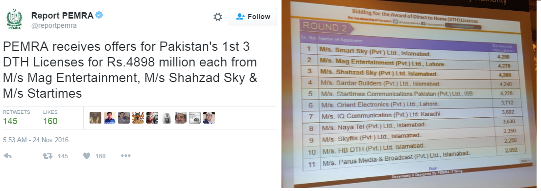 Three Direct-to-Home (DTH) Licenses worth Rs. 14.69 billion are awarded by Pakistan Electronic and Media Regulatory Authority (PEMRA) in an auction conducted on Wednesday 23, 2016.