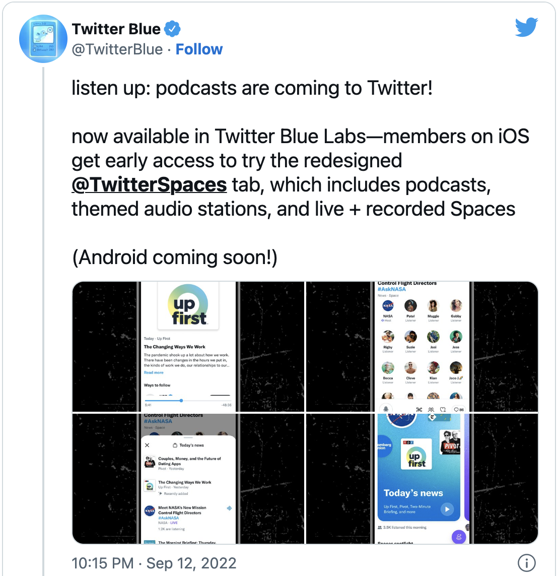 When Twitter initially announced that it will be bringing podcasts to its platform in the form of a revamped Spaces tab, the company stated that these podcasts would be available to a set of worldwide English-speaking consumers on iOS and Android devices. Now, Twitter has announced that it will begin testing podcasts with users who subscribe to Twitter Blue.