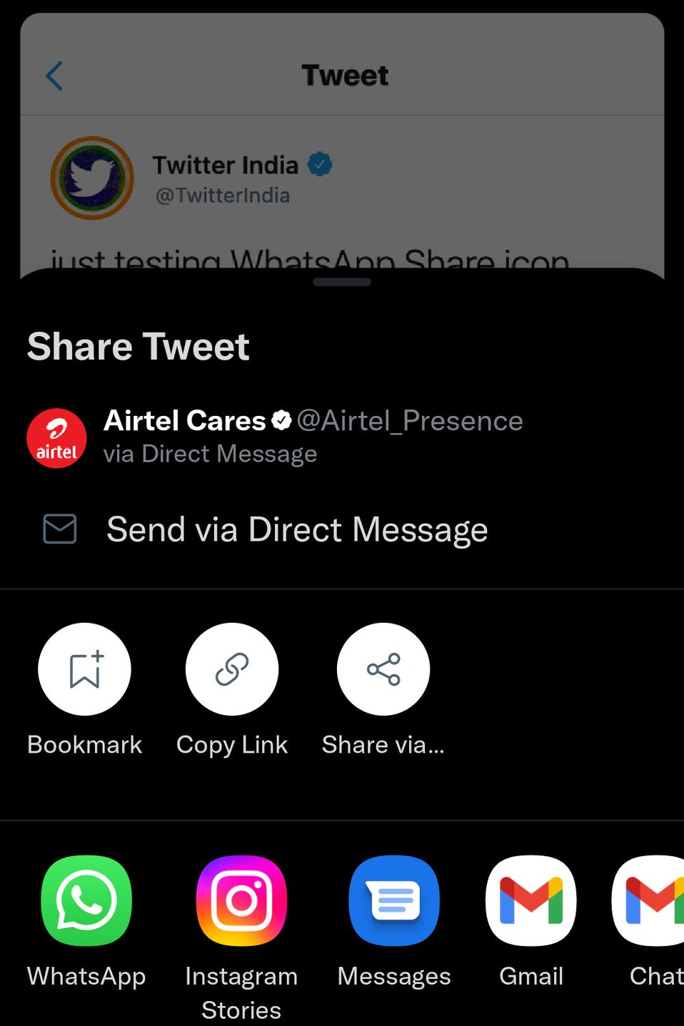 The usual share button located under a tweet will be replaced with a WhatsApp share button, which will offer a menu with additional choices such as bookmarking, sending through Direct Message, copying the link to the Tweet, and sharing on other social networking sites. However, because the WhatsApp symbol only takes the place of the share icon without altering its functionality, the implementation of this feature is inconsistent.