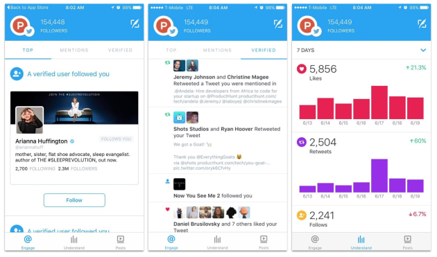 The Twitter Engage is specially designed for the influencers and is said to provide real-time analytics on quickly understanding, engaging, and growing the audiences. This feature also aids in following up with updates that could matter for the influencer exclusively, for example, the application will make special mention of a notification if any influencer starts following. The application also has a special tab for the Twitter stats. Audience demographics are aptly depicted through the usage of charts and are easily comprehendible.