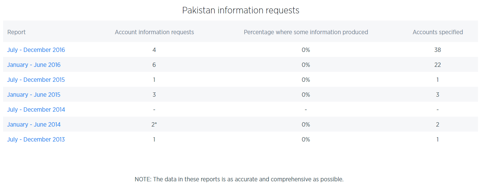 Other social networks also publish their transparency reports which include governments’ request to remove data, requests for information about users, requests by copyright owners etc. In 2016, Google fulfilled 13 percent of the requests made by Pakistan Government. Facebook revealed in “Government Requests Report 2016” that Pakistan made about 712 legal requests and 1015 account related requests, out of which, Facebook took action against 65.45 percent.