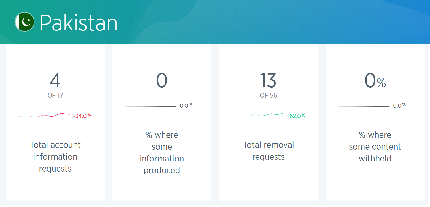 According to the Twitter Transparency report, Pakistan made four total account information requests between July and December last year, compared to six requests made during the first half of 2016. Although the number of requests made was lower, the number of accounts specified in the requests had increased from 22 in the first half of 2016 to 38 in the second half.