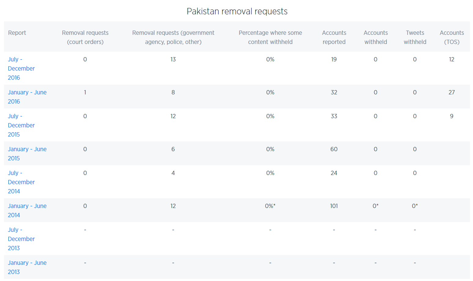 Pakistan also made 13 requests to Twitter for the removal of 19 accounts between July to December last year, compared to eight removal request for 32 accounts in the first half of 2016.