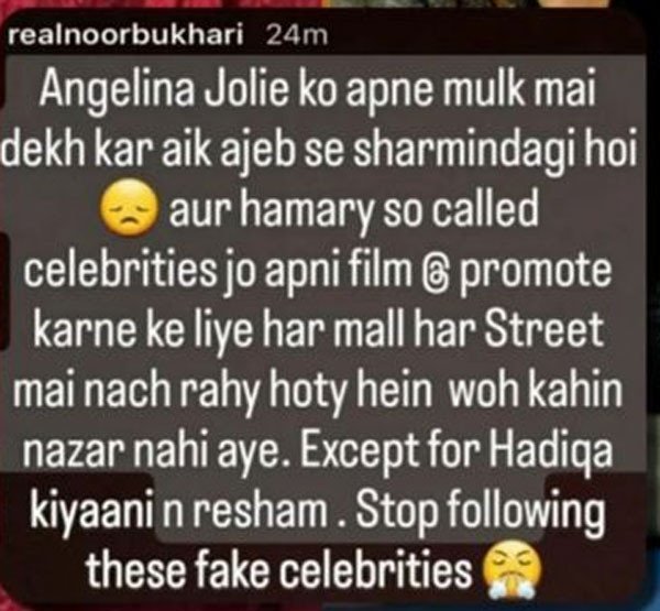 A former actor Noor also shared her views by saying, “Watching Angelina Jolie visiting Pakistan is embarrassing when our so-called celebrities. These celebrities reach every mall and dance on every street for promotional events for their upcoming projects but are now nowhere. Hadiqa Kiani and Resham are exceptional people otherwise no one is ready to help “.
