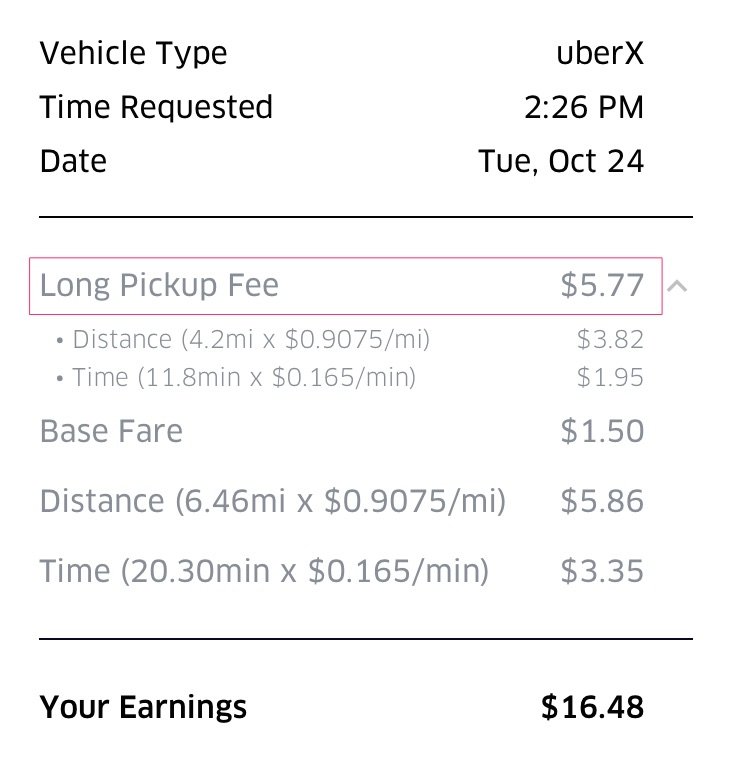 The 8 minutes pick up time is average, according to Uber, the decision that when the extra charges should be applied depends on the market and the length of the pickup. One example of how the extra charges are effective is shown above in which the passenger is charged extra $5.77 for a 4.2-mile pickup that took 11.8 minutes of driving.