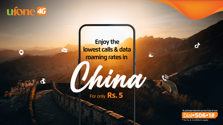Ufone is offering its roam-like-home services at the industry’s cheapest straight rate for all services including incoming and outgoing calls and internet at Rs. 5 per 30 seconds and Rs. 5 per MB respectively. This service is already activated on all Ufone prepaid numbers for the convenience of the users. In addition, Ufone data roaming will allow users to access all the social media apps hassle-free and without any disruption in China. The data service can be activated by simply dialing *506# and following the instructions.