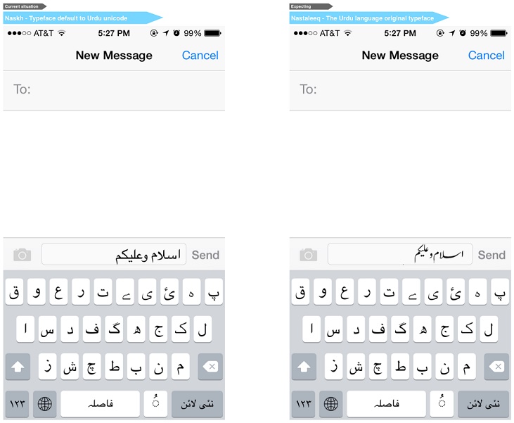 On 5th October 2014, Mudassir penned an open letter to Apple’s CEO Tim Cook and Sir Jonathan Ive, pertaining to the issues that Urdu speakers were having with the Mac OS X, iOS and Urdu default typeface. The letter was sent via postal mail on the 8th October, 2014. Apple had integrated an Urdu keyboard at the launch of iOS 8 which used the Urdu unicode derived from Arabic. The typeface used was Naskh which did not deliver the quality of writing and the basics. The alternative typeface proposed by Mudassir was Nastaleeq as showed in screenshots below: