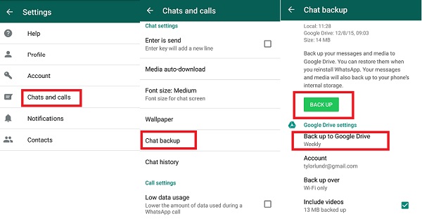 Tap the three-dot menu from the top-right corner of your WhatsApp screen and then go to Settings > Chats > Chat Backup. Now tap the Back up button. You can select a backup frequency (Time duration) to let WhatsApp automatically back up your chats by tapping the Back up to Google Drive option. However, if this is the first time you are backing up your WhatsApp data, you also need to select a Google account by tapping the Account option.