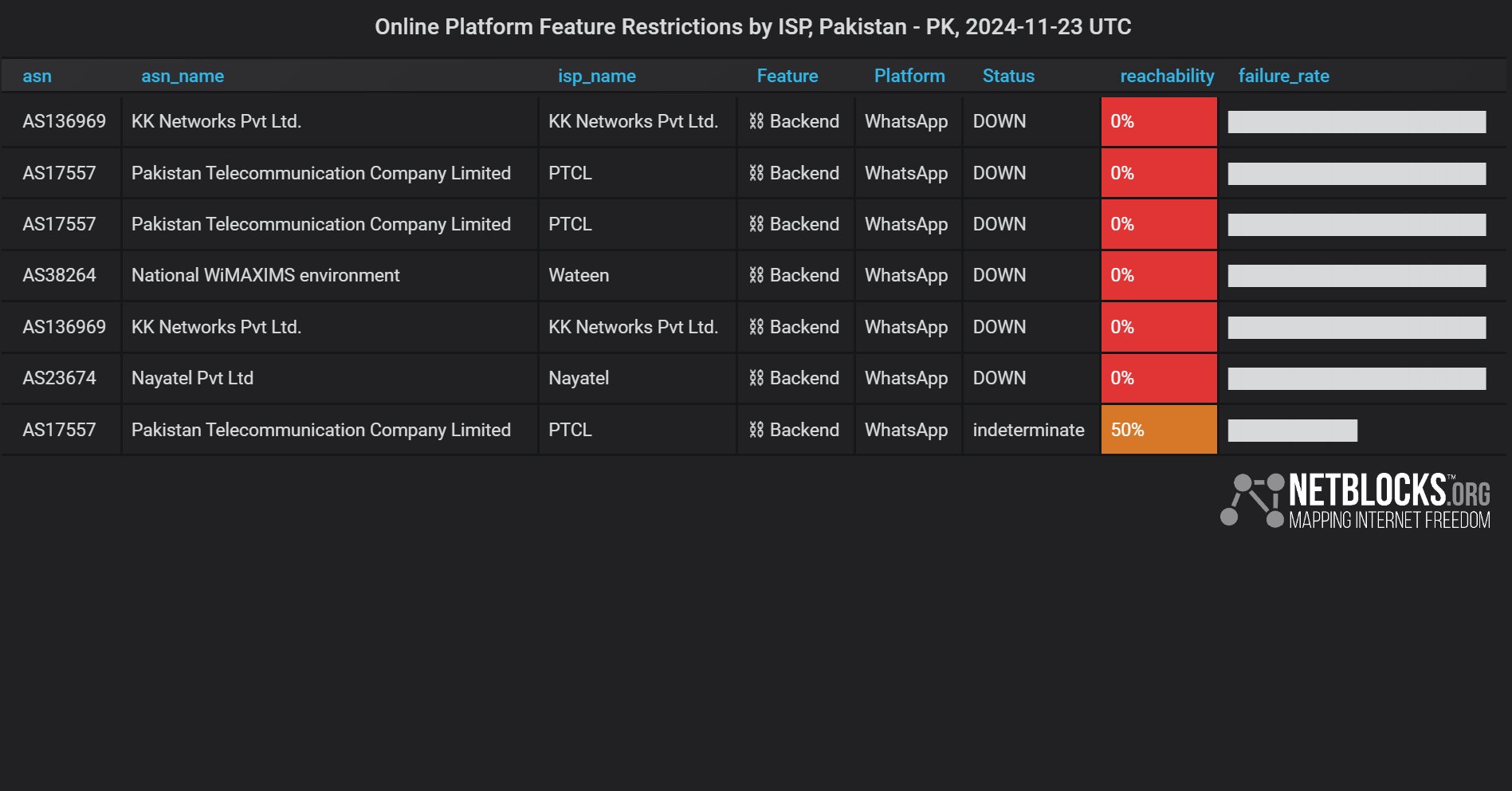 According to a graphic shared by NetBlocks, the reachability of WhatsApp is zero on the majority of ISPs. However, NetBlocks stated that WhatsApp is still accessible on 50% of the servers connected to Pakistan Telecommunication Company Limited.