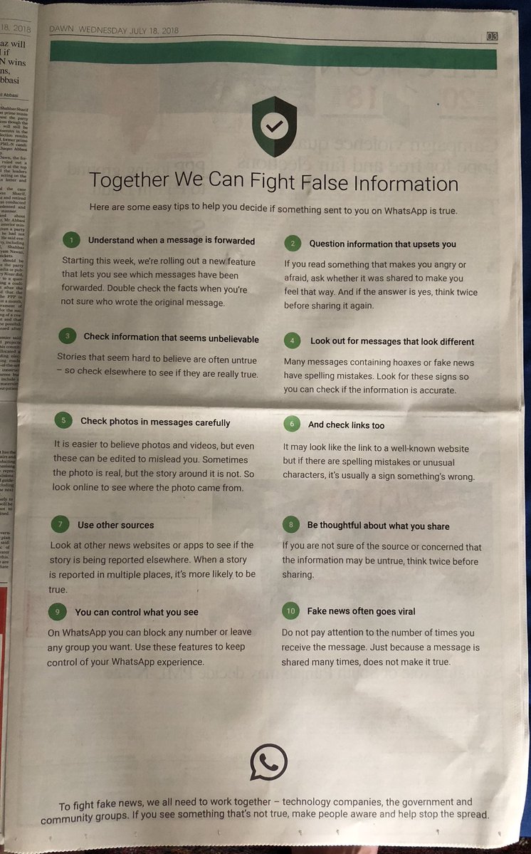 WhatsApp has taken a full-page ad in the paper edition of Pakistan’s leading newspaper, Dawn to inform readers of ways to identify fake messages.
