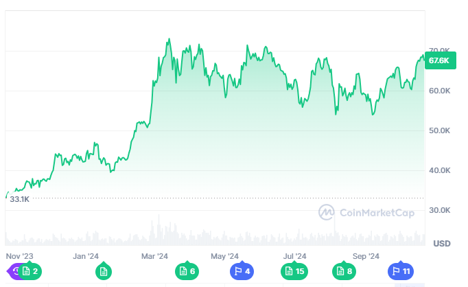 In light of Bitcoin’s recent increases, many are wondering if it could soon make the incredible jump to $100,000. The stage is set for possible breakthroughs with the increasing interest from institutions and the changing dynamics of the market. Will Bitcoin hit $100k next, given its current price of $67,632.06? What role will market mood, ETF approvals, and the US election play in determining its path?