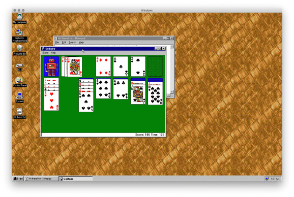 The Windows 95 seems to be like a full-fledged standalone version of Windows 95. It can run some of the applications including Notepad, Paint, Solitaire and Minesweeper. Other applications are not functional. One interesting thing to note here is that you don’t need to go through the entire booting process of the operating system, it starts as soon as you open the application.