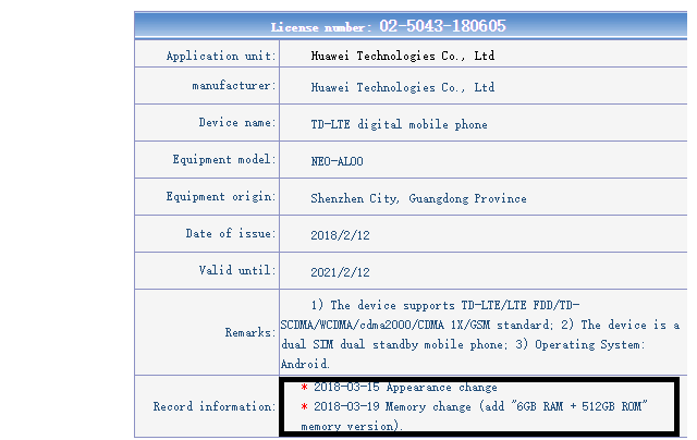 According to the image on the website, the smartphone with model number NEO-AL00 will come with 6 GB RAM and internal storage of 512 GB. If this news is true, this will be the World’s first smartphone with the highest internal storage because the maximum storage capacity ever on any smartphone is 256 GB.