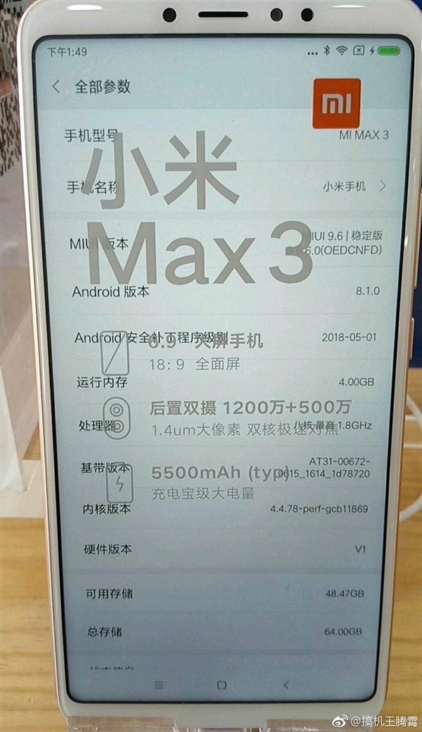 The Mi Max 3 is expected to launch in three variants. One variant with 3 GB RAM and 32 GB storage. Second with 4 GB RAM and 64 GB storage (shown in leaked image) and last with 6 GB RAM and 128 GB storage (Huawei’s flagship phone, P20 Pro has the same setup).