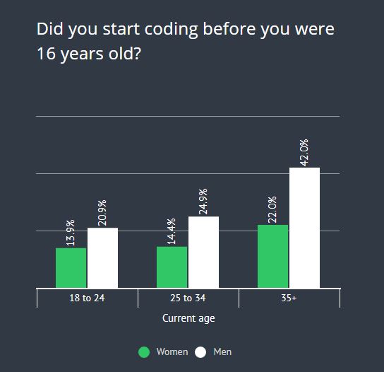 The report observed the trend of a reduced gender gap in age of learning to code. The survey results tell, there was a 20 percentage point gap between men and women over 35 who began coding before 16 years old. Today that gap has shrunk down to just 7 percentage.