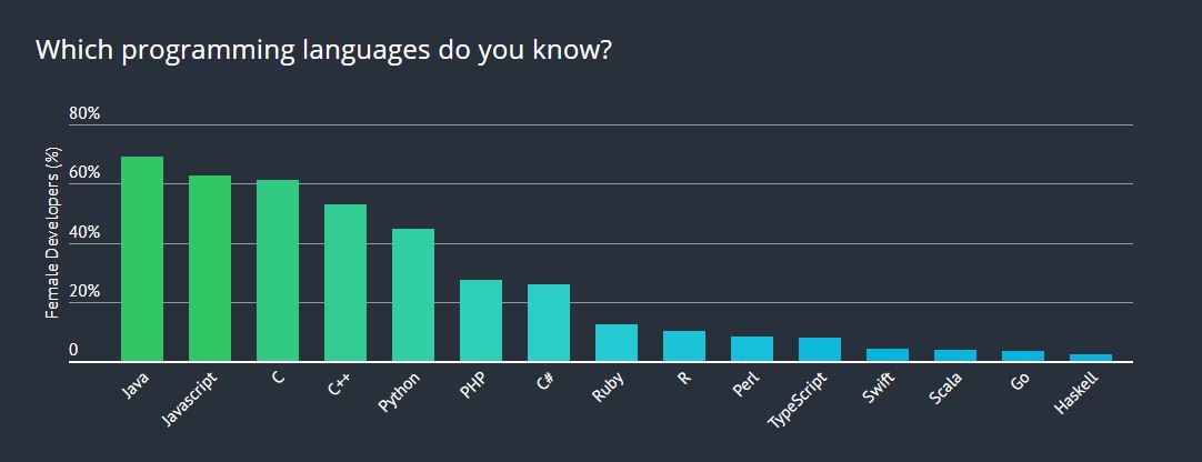 For roles across front-end and back-end, few of the most in-demand languages are Java, JavaScript, C, C++, and Python. According to the survey, over 60% of the female developers are proficient in Java, JavaScript, and C, while over 40% can develop in C++ and Python.