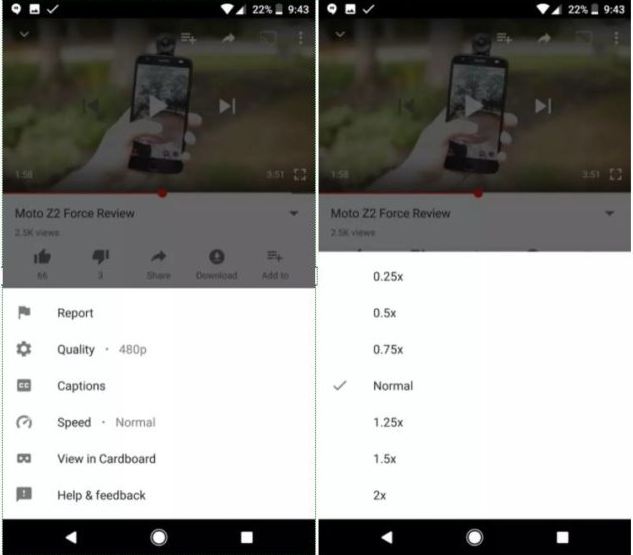 At first, the feature will be available in YouTube’s Android app. As shown in the pictures, the company, for the testing purpose, has embedded one more option named as “Speed” in its mobile app video setting, allowing users to choose to slow down video speed to as low as 0.25x or as high as 2.00x.