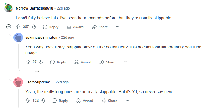 Some Redditors took YouTube’s side, saying that the lengthy ad might have been caused by adblockers, while others blamed the extension, saying that it had hidden YouTube’s Skip button.