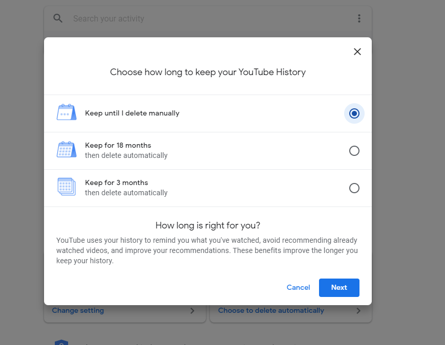 • You can select to have Google delete your YouTube history after three months or after 18 months. You can also choose the “Keep until I delete manually.